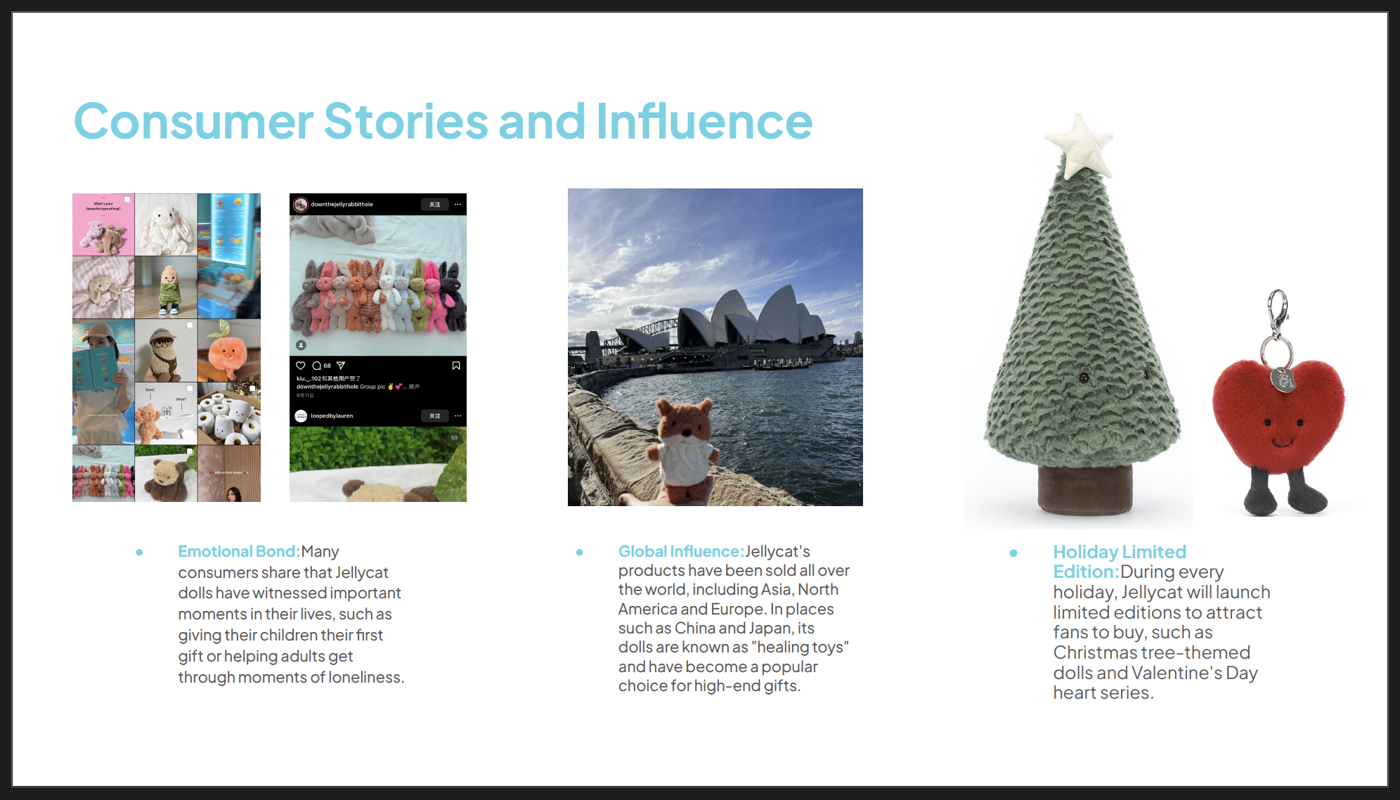 In the initial research phase, I conducted a comprehensive analysis of Jellycat’s brand background, market positioning, and communication strategy. I examined the brand’s social media influence and audience engagement across platforms, identified its target user segments, and studied its existing product lines and collections. This groundwork provided key insights into how Jellycat connects emotionally with consumers and informed my later design decisions for functional updates.